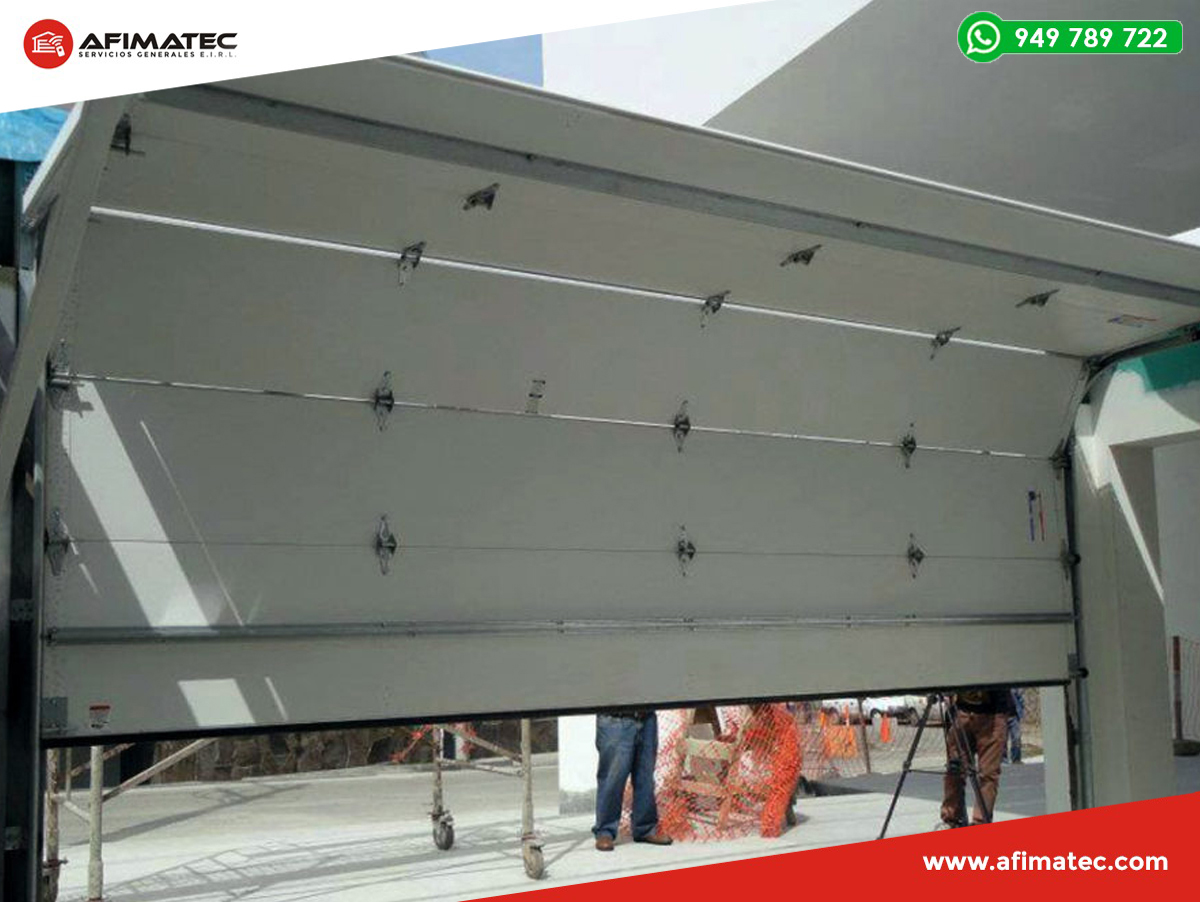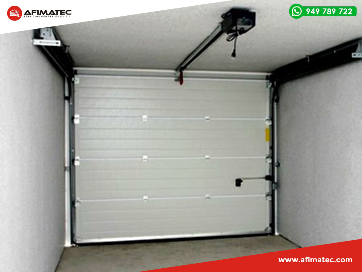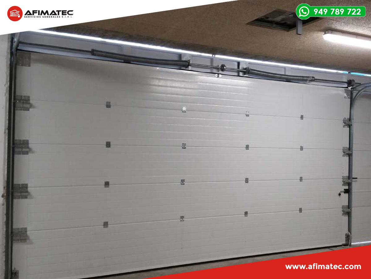 En AFIMATEC realizamos venta, instalación y mantenimiento de puertas seccionales, las cuales, están básicamente formadas por 4, 5 y/o 7 paneles, que se elevan a través de unas guías laterales y son compensadas mediante un sistema de resortes de torsión. Tienen extraordinaria suavidad de funcionamiento: las secciones se deslizan hacia arriba, sobre unas robustas guías de acero galvanizado, mediante rodillos regulables de material sintético que incorporan rodamientos a bolas.